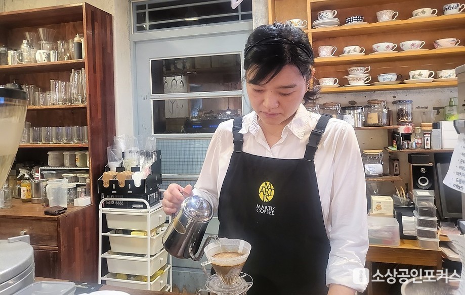 | ▲ 하진심 대표가 직접 커피를 내리고 있다. (사진 = 김영란 기자 / 소상공인포커스 DB) |