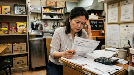 | ▲ 위 사진은 기사 내용과 무관하게 AI(인공지능)가 생성한 이미지입니다.불투명한 관리비 고지서를 들여다보며 당혹해하는 소상공인. (사진 = 챗GPT) |