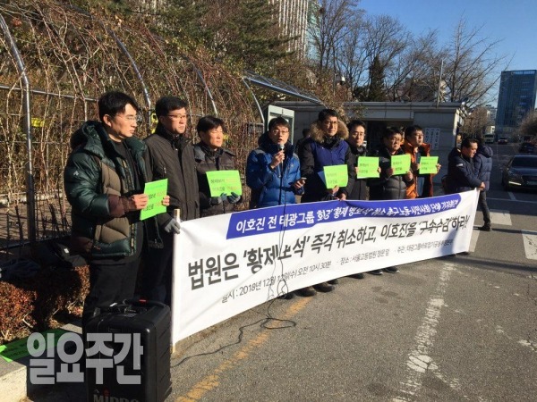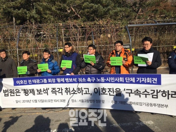 [소상공인포커스=이수근 기자] 이른바 '황제보석' 논란에 휩싸인 이호진 전 태광그룹 회장의 병보석 취소와 구속 수감을 요구하는 각계각층의 목소리가 커지고 있는 가운데 노동?시민사회단체는 12일 오전 10시30분 서울고등법원 정문 앞에서 '황제보석 규탄 및 법원의 병보석 취소 결정 촉구 기자회견'을 개최했다.